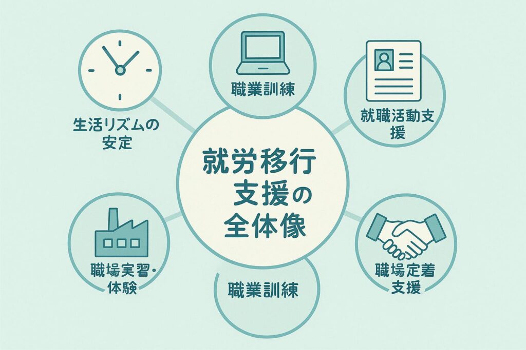 就労移行支援は、就職に必要な知識やスキルを習得するための様々なプログラムを提供し、利用者が自立した社会生活と安定した就労を実現できるよう支援します。単に仕事を見つけるだけでなく、長く働き続けるためのサポートも含まれるのが特徴です。
